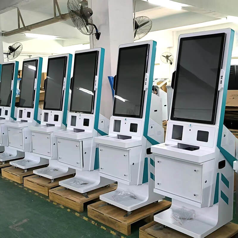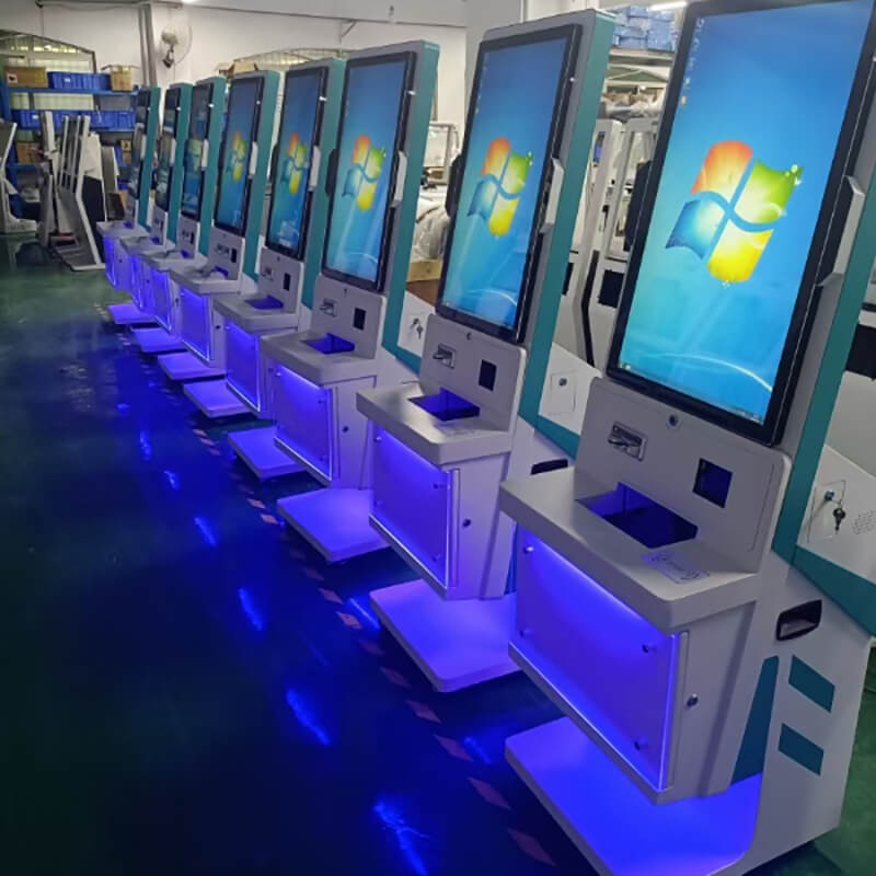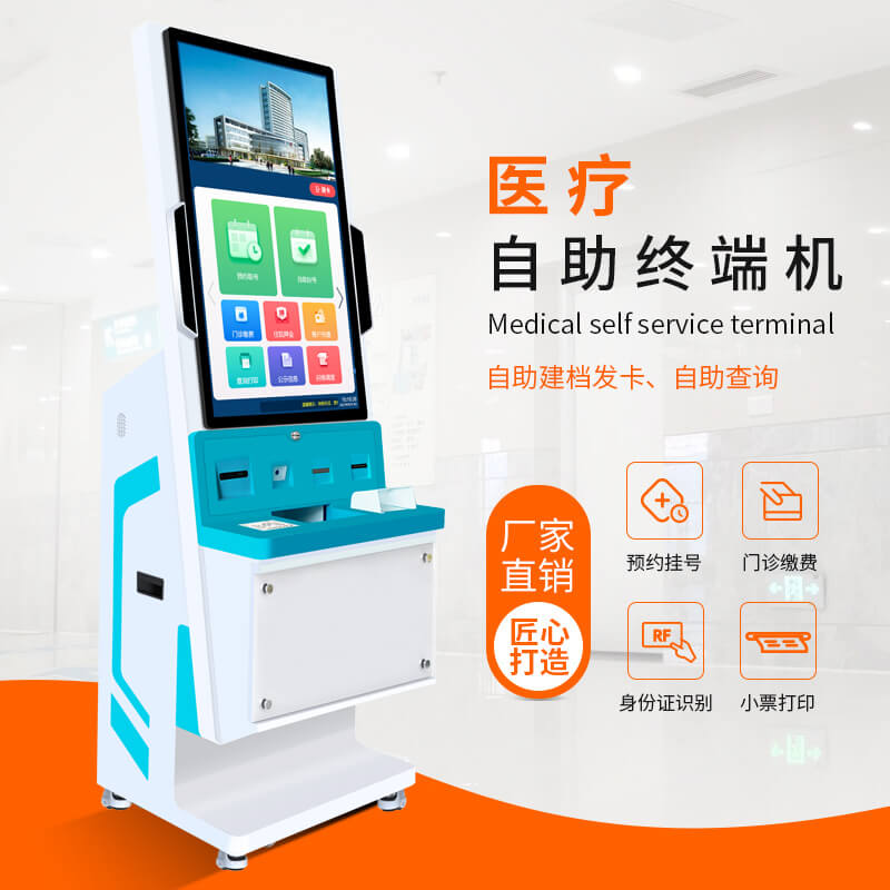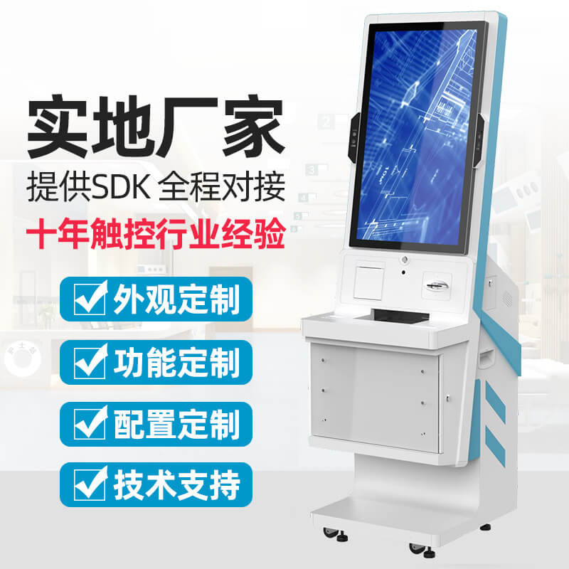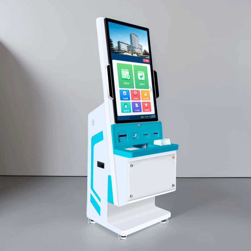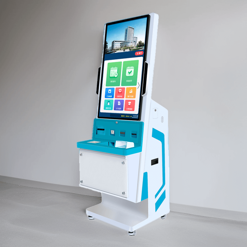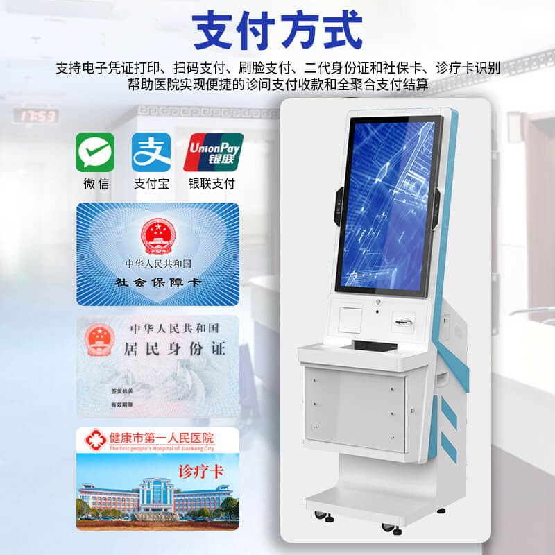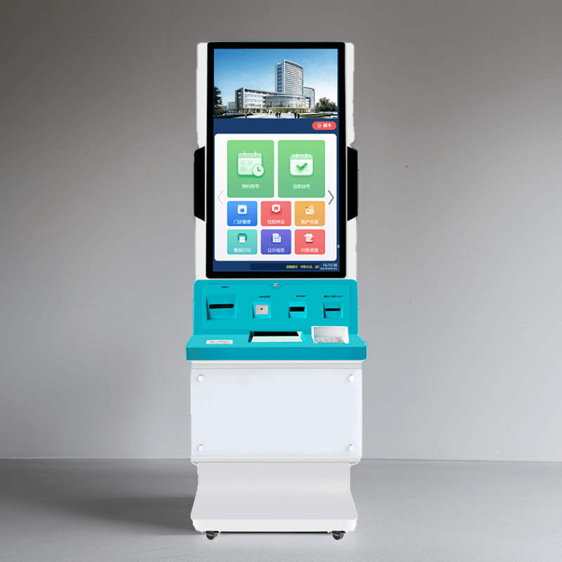 該終端機采用 32 英寸 IPS 高清觸控屏,分辨率 1920×1080,亮度 300cd/m2,響應(yīng)時間 5ms,支持 10 點觸控;配備雙 200 萬像素支付寶 / 微信專用攝像頭,支持二維碼高速識別與光線自適應(yīng);集成符合 ISO 14443 標準的二代身份證讀卡器及全國統(tǒng)一社保接口的社保讀卡器;打印系統(tǒng)含熱敏式小票打印機(150mm/s 打印速度)與可選激光 / 噴墨 A4 打印機;處理器為四核 ARM Cortex-A55(2.0GHz 主頻,可選 Intel 賽揚),存儲 4GB RAM+64GB ROM(可擴展至 128GB);接口包括 4×USB 3.0、RJ45 網(wǎng)口、HDMI、DC 電源接口及 WIFI / 藍牙模塊;電源 AC 220V±10%/50Hz,功耗≤150W(待機≤10W),工作環(huán)境溫度 0℃~40℃、濕度 10%~90%(無冷凝)。