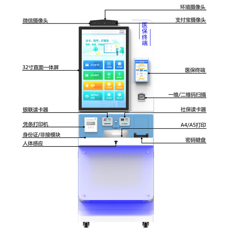 該32寸直面醫(yī)保終端整機(jī)功耗121W,工作溫度-10℃~60℃,存儲(chǔ)溫度 -20℃~70℃,整機(jī)尺寸707.2×700×1851.9mm,包裝尺寸 8149×823×1990mm。其32寸直面一體屏分辨率1920×1080,觸摸精度≤4mm,亮度350cd/m2;工業(yè)主機(jī)可選Intel i3/i5/i7處理器,搭配 4G/8G內(nèi)存與128/256/512GB固態(tài)硬盤(pán),支持Windows 7/10及Linux系統(tǒng)。醫(yī)保終端模塊采用 MTK8788 處理器(12nm 工藝,2.0GHz 主頻),4GB+64GB 存儲(chǔ),運(yùn)行 Android 9.0 系統(tǒng),支持 2.4G/5G雙頻WiFi與3G/4G網(wǎng)絡(luò)。設(shè)備通過(guò)EN55011、CCC等認(rèn)證,MTBF達(dá)50000小時(shí),ESD空氣放電8kV、接觸放電4kV,集成激光打印機(jī)(38ppm打印速度)、一維 / 二維碼掃描器(5mil 識(shí)讀精度)、多模式攝像頭(支持0.25-1m人臉識(shí)別)等模塊,滿足醫(yī)療場(chǎng)景全流程自助服務(wù)需求。